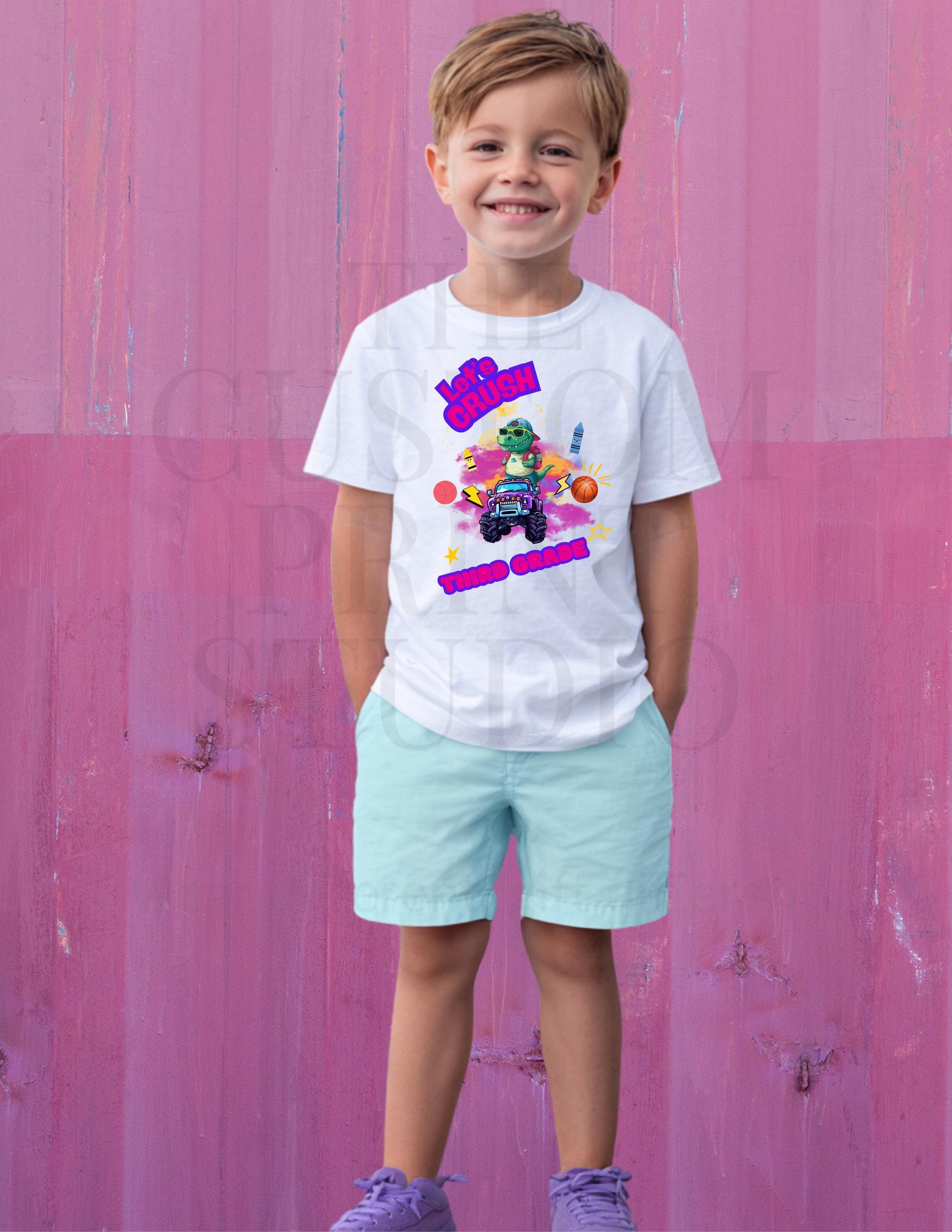 The Let’s Crush 3rd Grade Shirt is the perfect 3rd grade shirt to help your child start the school year with confidence and style. This back to school tee features a cute dino monster truck design that appeals to both boys and girls, making it an ideal first day outfit. Crafted from soft cotton, this youth dinosaur shirt ensures all-day comfort in a breathable, unisex kids shirt fit. Personalize this customizable youth tee with grades ranging from Kindergarten to 3rd grade, so your child can proudly show off their personalized grade shirt.